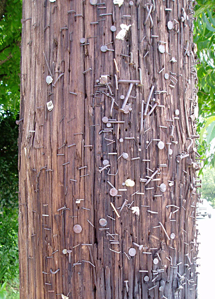 I’ve seen many poles like this, but not until your photo did I connect it to the African nail figures where nails driven into the figure represents the taking of an oath, the witnessing of an agreement, each nail increasing the power of the figure. I’ll always see them that way now, thank you.