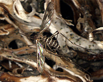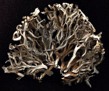 Above is one with a piece of root or lichen, a bit smaller than the palm of my hand, that I’d picked off a beach long ago. Isn’t it amazing? Of course you can’t see it here very well in this low resolution and small size, but when I looked at it full screen size, guess what I discovered there: a tiny dead but fully intact insect with its wings spread out. I’ve cut out that portion and blown it up some more. Can you see it in the image below?