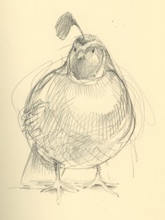 While visiting my family in Los Angeles (actually, the dry hills north in Ventura County) I got to watch the birds come to the feeder: lesser and American goldfinches, white-crowned sparrows, mourning doves, California towhees, American crows, rock doves, house finches, scrub jays, yellow-rumped warblers, and best of all, a pair of California Quail attracted by cracked corn on the ground. Got to sketch one from the breakfast table.