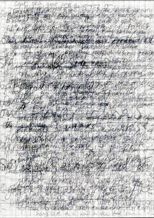 It occurs to me that with more and more writing taking place exclusively on electronic media, the process becomes increasingly fugitive and invisible, so attempts like this to record it necessarily become artificial re-creations after the fact. We have become aware in this collaboration that a blow-by-blow, unedited record of the process is neither desirable nor really possible. Probably this doesn’t matter. I see it as a little like turning over a piece of weaving to see the reverse side, with its knots and ends and rough bits; you see something of the finished process, not in linear form in the order it was achieved, but dotted about over the surface you don’t normally see.