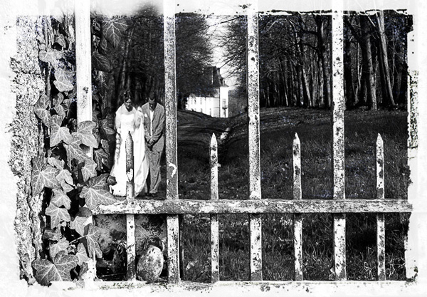 I then thought of Wendell Berry’s poem, “Country of a Marriage,” which I think is a rather smug, comfortable, male view of a marriage. And that got me wondering if I could subvert Lucy’s two photographs into a single image that had the feel of a French film still, and then write a poem in the voice of a bride that had something of the mood of the photograph. I tackled the images first, but try as I might I couldn’t get the couple at the angle I wanted on the path, until I had the idea of flipping the whole country house shot horizontally using Photoshop. This worked really well, as it put the gate pillar on the left opening up the scene, and when the couple were added in it put the bride on the groom’s right, making her seem the more powerful figure who was doing all the talking while he took on a rather hangdog expression.
