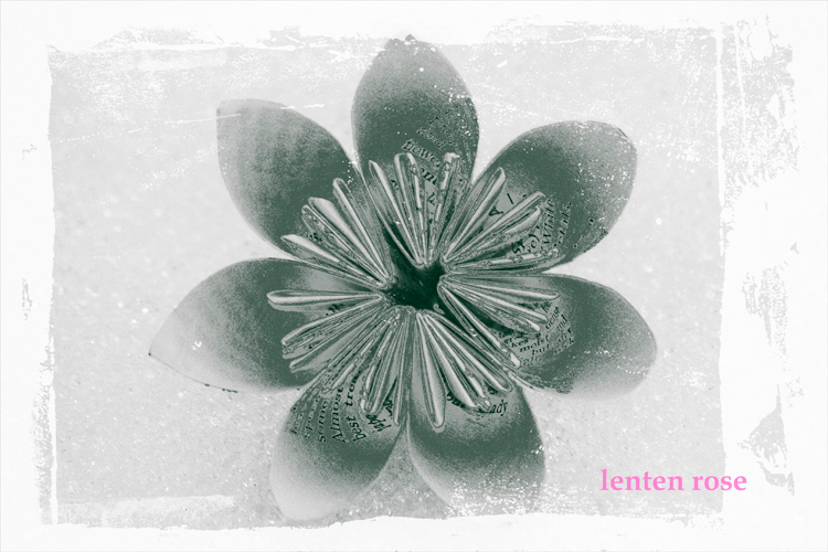 This is a photograph of an origami flower made from an old gardening book. The flower was a gift; I don’t know who made it. But I’m grateful for the opportunity to participate in a chain of translation: from idea to paper, paper to form and form to a solarised photograph.