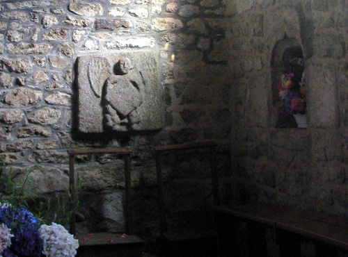 Unless the power is within the place, rather than its furniture and artifacts. This has always been a sacred place, a place of healing; the chapel and the Saints are quite recent emanations of this. If you walk west from the chapel, past some prehistoric standing stones, into a wooded ravine, you’ll come to the holy well. In mediaeval times it was dedicated to St Tujan, and has been a sacred place probably since the bronze age; Gallo-Roman remains have certainly been found there. People throw the age-old votive offerings of coins into the well. There is a stone cross and other stone artefacts from who know where set up here. A fallen tree covered in ivy forms an arch in front of it. On the ivy stems someone has inscribed the words ‘Cécile tu nous manques’ — ‘Cécile we miss you.’
