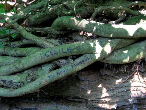 Who knows who Cecile is or was and why she is missed, but someone brought their sadness, their angoisse to this particular place of power and left it as an offering in these words, a poignant counterpoint to the marble plaques of gratitude.