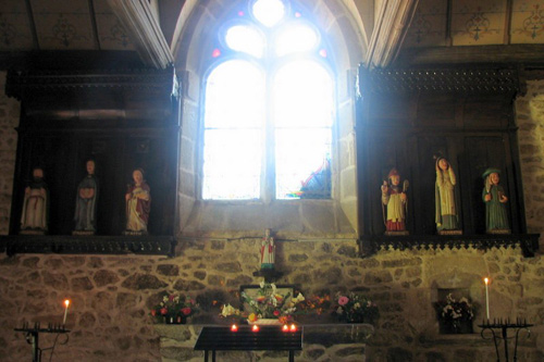 These photos were taken at the Chapel of Notre Dame du Hault, in Trédaniel, Côtes d’Armor, Brittany. It is the home of “Les Sept Saints Guéurisseurs,” the Seven Healing Saints, polychrome wood sculptures of uncertain age and provenance, each invested with the power to relieve certain afflictions. (Click on the photos to see larger versions.)