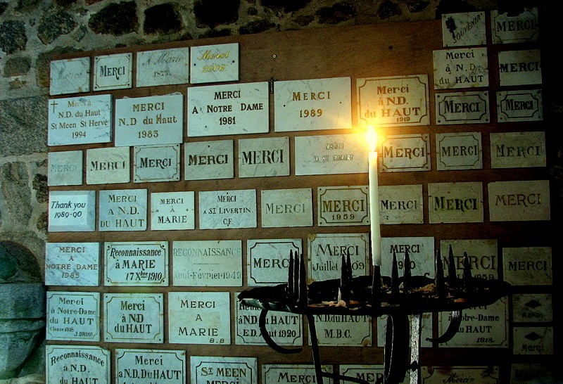 For a long time people brought gifts and offerings, oblations, for the Saints’ favours, either to propitiate or to thank them. They gave money, but also things like linen, hemp, butter, honey and beeswax, even piglets. The revenues from the chapel were enormous for such a small, out-of-the-way place. But by the end of the 19th century people began to offer other kinds of votives, these little plaques, mostly marble with engraved gilded lettering. They are in thanks for services rendered, and mostly simply say ‘Merci,’ Thank you, one or two are in English, some quite recent. (Many are also to Notre Dame to whom the Chapel is dedicated) The effect of the same word in different variations over and over in the gloom and candlelight is rather hypnotic.
