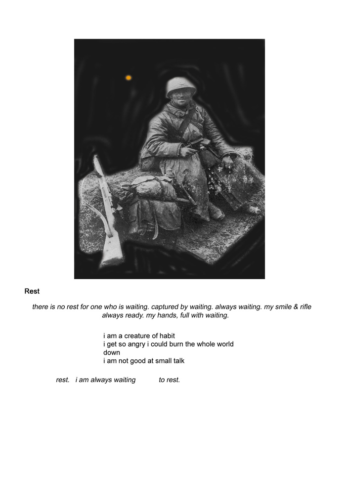 Sig is a German painter. He altered WWI photos and i poemed along to the image. There are 55 of ’em in total. As far as process goes, it’s like call and response. Sig sent his altered photos and i looked and shot, so to speak. Based on his titles and the images i went really on a mental cutup and spontaneous reaction in most cases too.